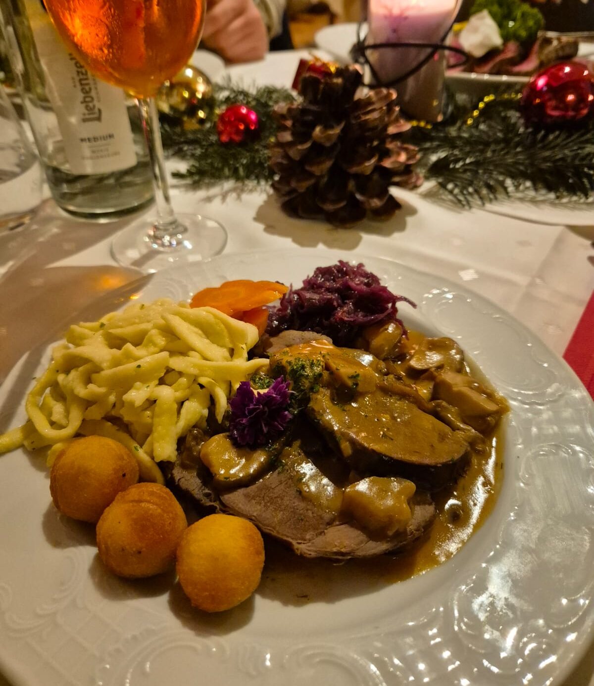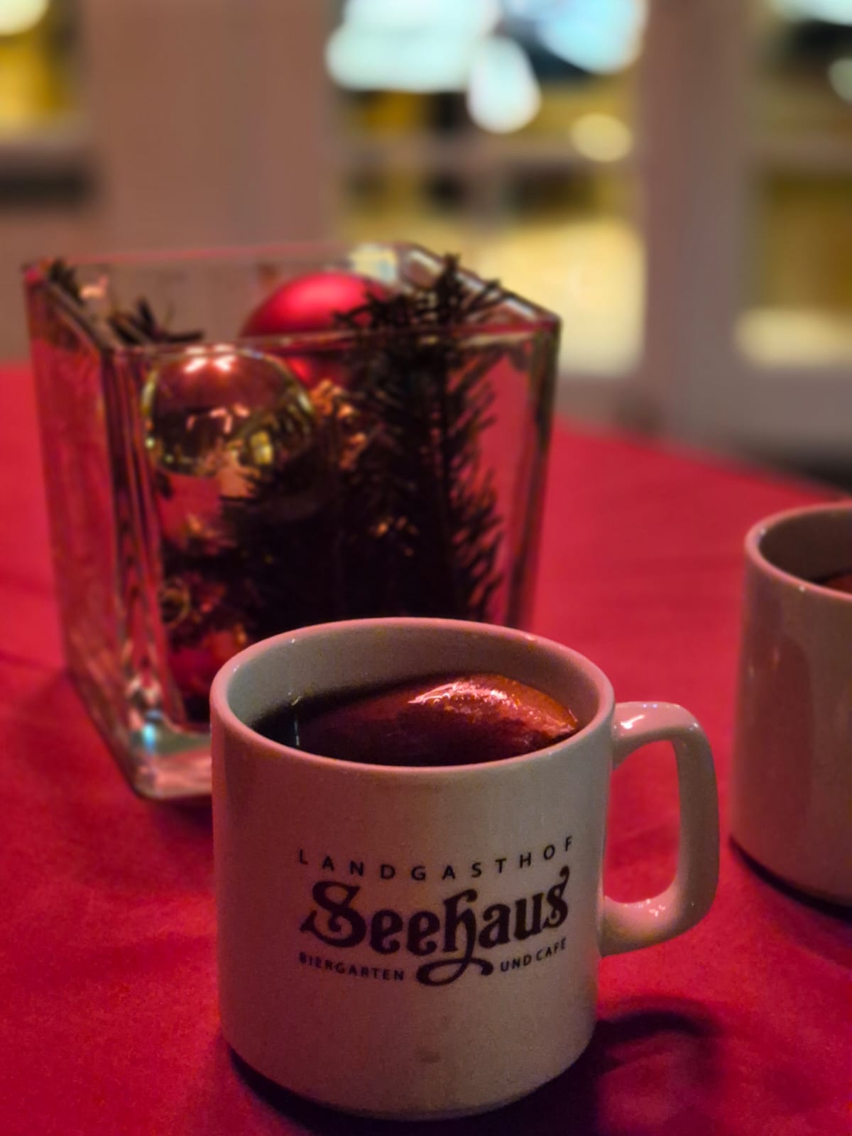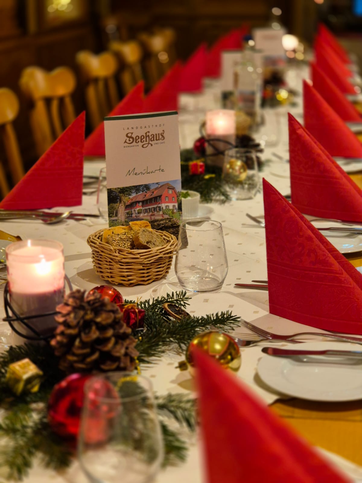 Am Nachmittag machten wir uns dann gemeinsam auf den Weg ins Seehaus nach Pforzheim. Dort erwartete uns zur Begrüßung ein wärmender Glühwein oder Punsch im Freien – genau das Richtige, um die winterliche Stimmung zu genießen. Anschließend nahmen wir Platz an einer liebevoll dekorierten Tafel, an der wir ein hervorragendes Essen genießen durften.